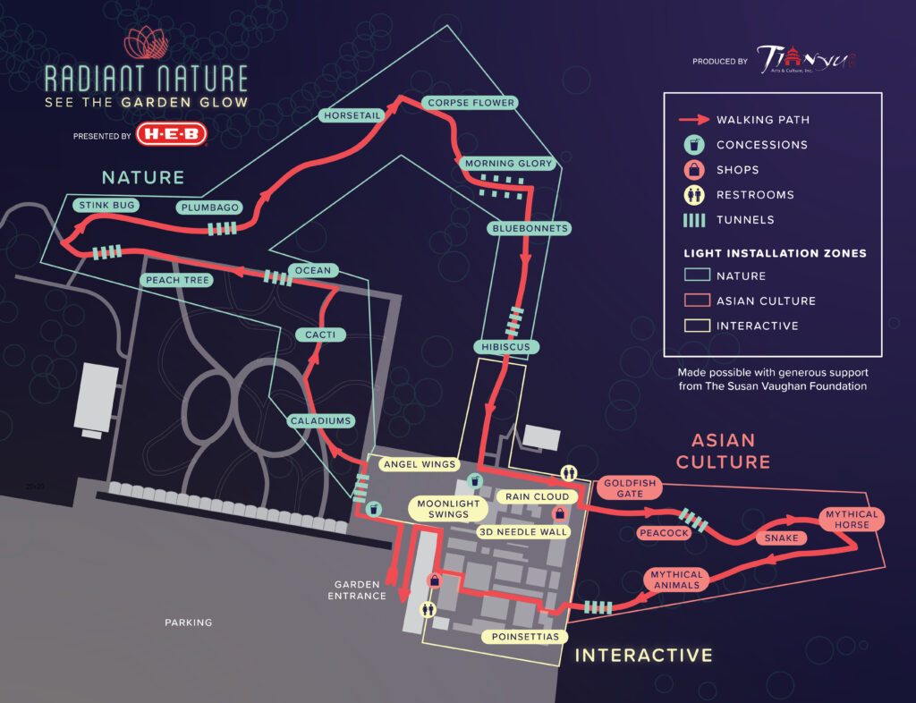 Radiant Nature, presented by H-E-B with generous support from The Susan Vaughan Foundation, is an unforgettable adventure for the entire family. In its third season, highlights include a towering peach tree, a pair of mythical horses, bluebonnets, poinsettias, and much more. The interactive zone again features illuminated swings and an angel wings photo spot, plus a collection of new immersive, Instagram-worthy features sure to put a smile on the faces of visitors of all ages.