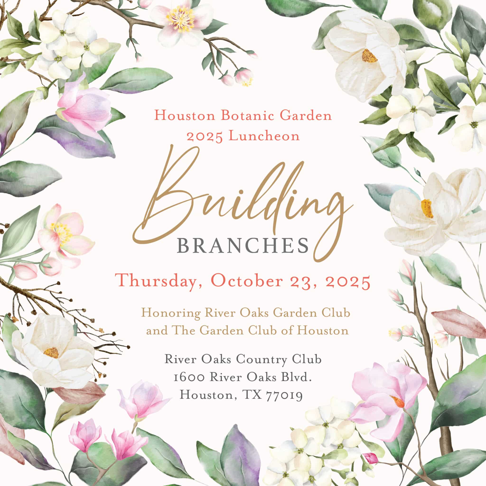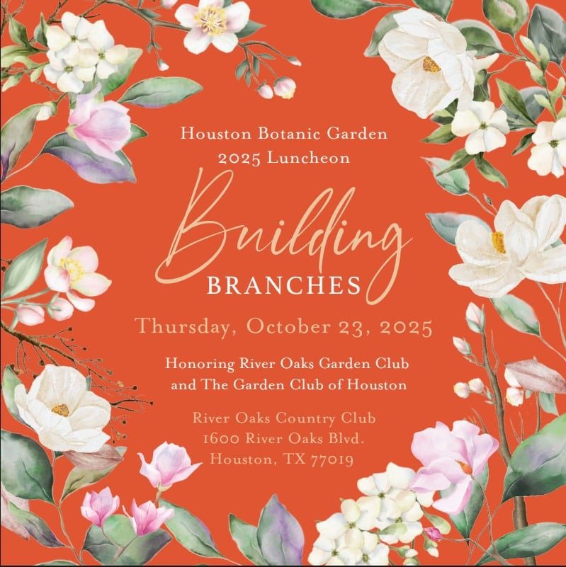 Join the Houston Botanic Garden for our Annual Luncheon on Thursday, October 23, 2025, at River Oaks Country Club. Check-in and a reception will be held from 11 a.m. to 12 p.m. The luncheon and program will be held from 12-1 p.m.